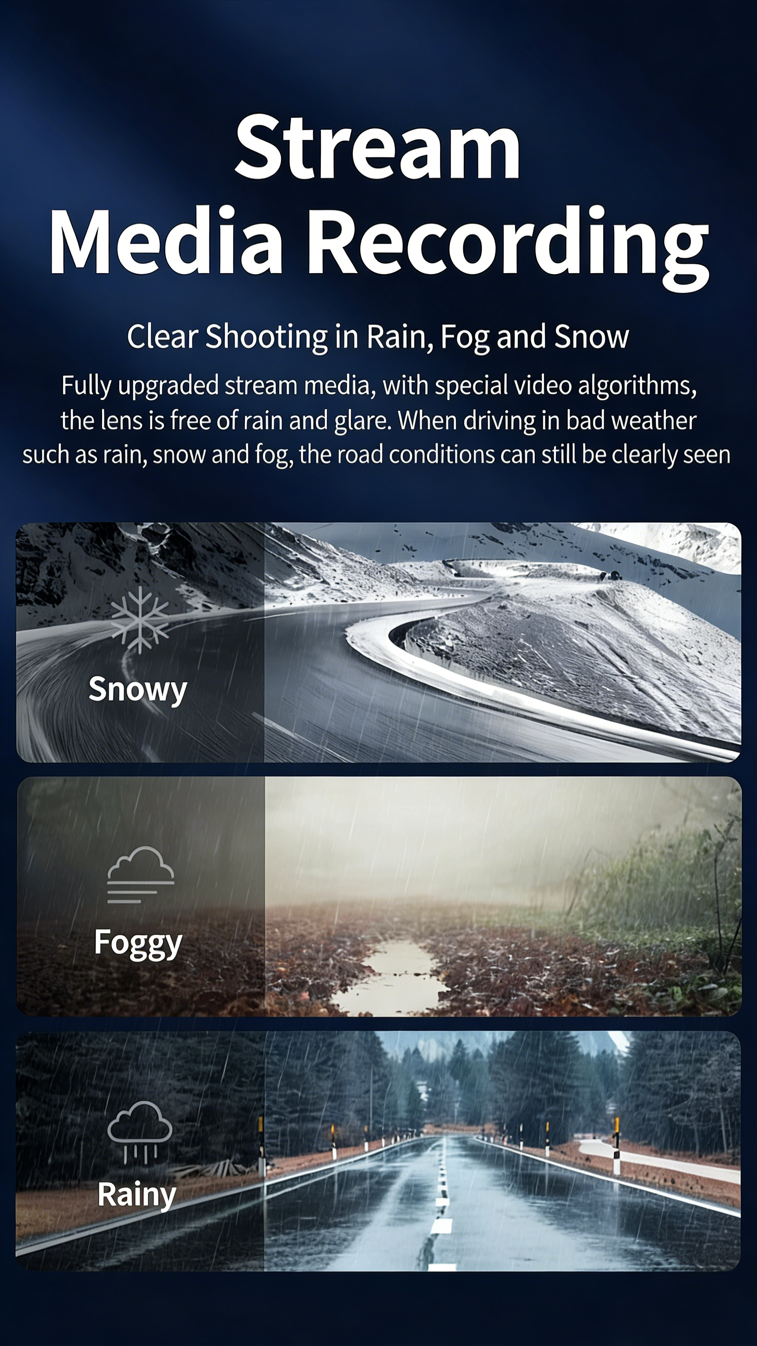 Stream Media felvételi technológia:Még eső, hó vagy köd esetén is tisztán rögzítheti a külső környezetet, biztosítva, hogy bármilyen időjárási körülmények között is láthassa a tiszta képeket. 🌧️❄️