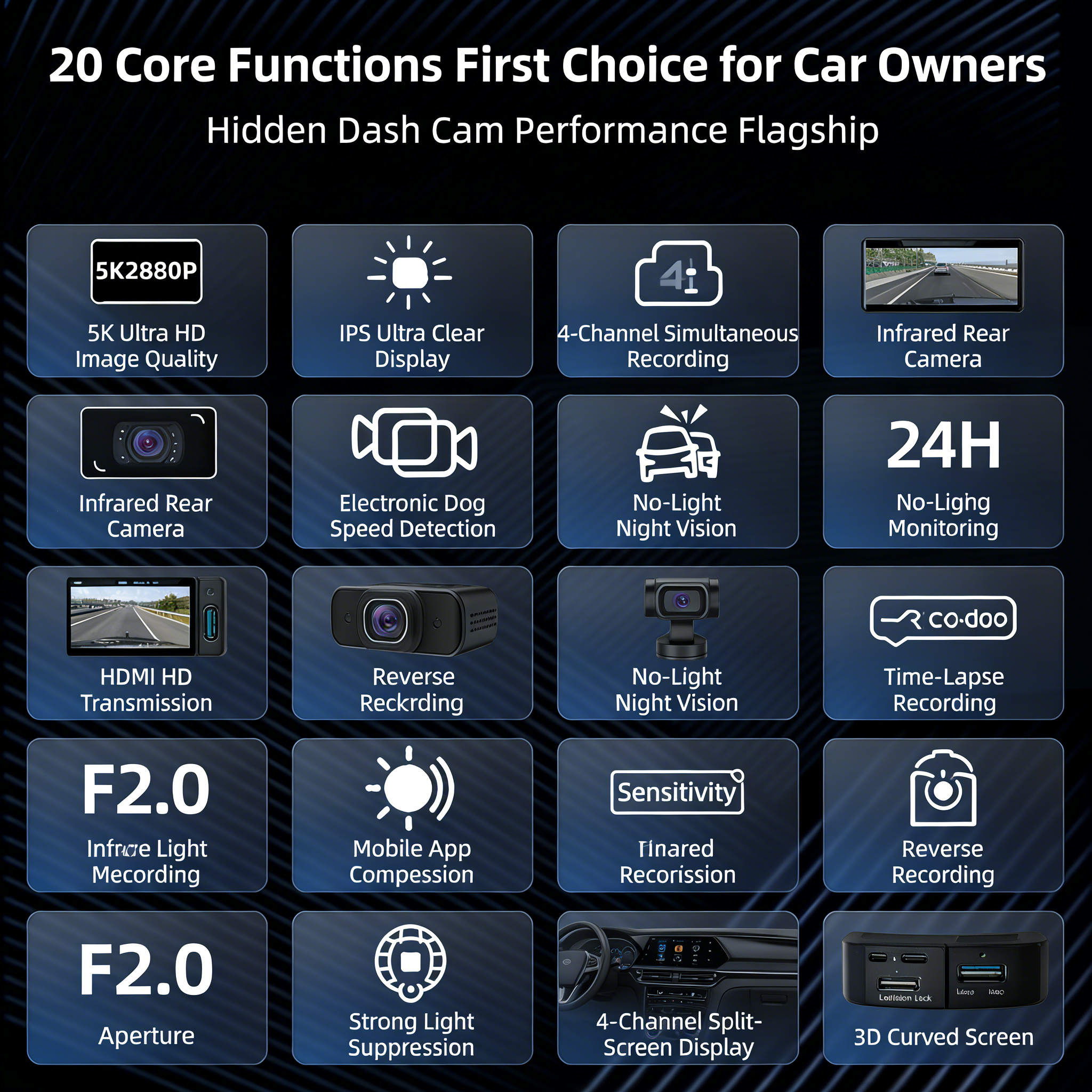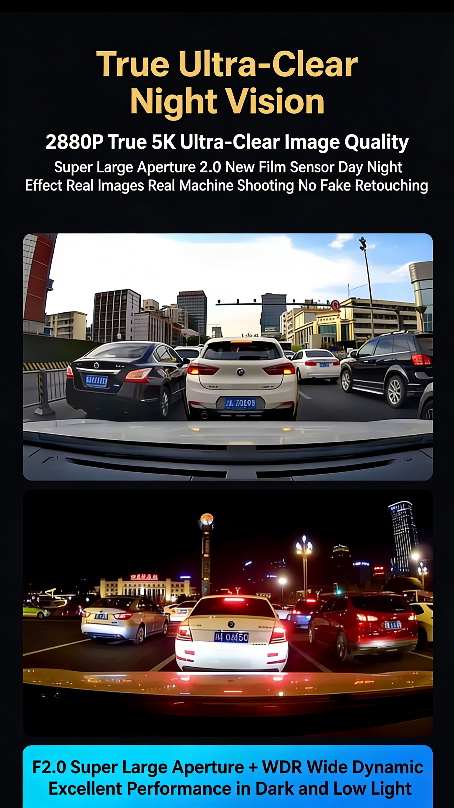 5K Ultra HD felbontás:Az 5K ultra HD elülső kamera és 1080P hátsó kamera minden részletet tisztán láthatóvá tesz a jármű belsejében és kívül, rögzíti minden fontos vezetési pillanatot. 🔍