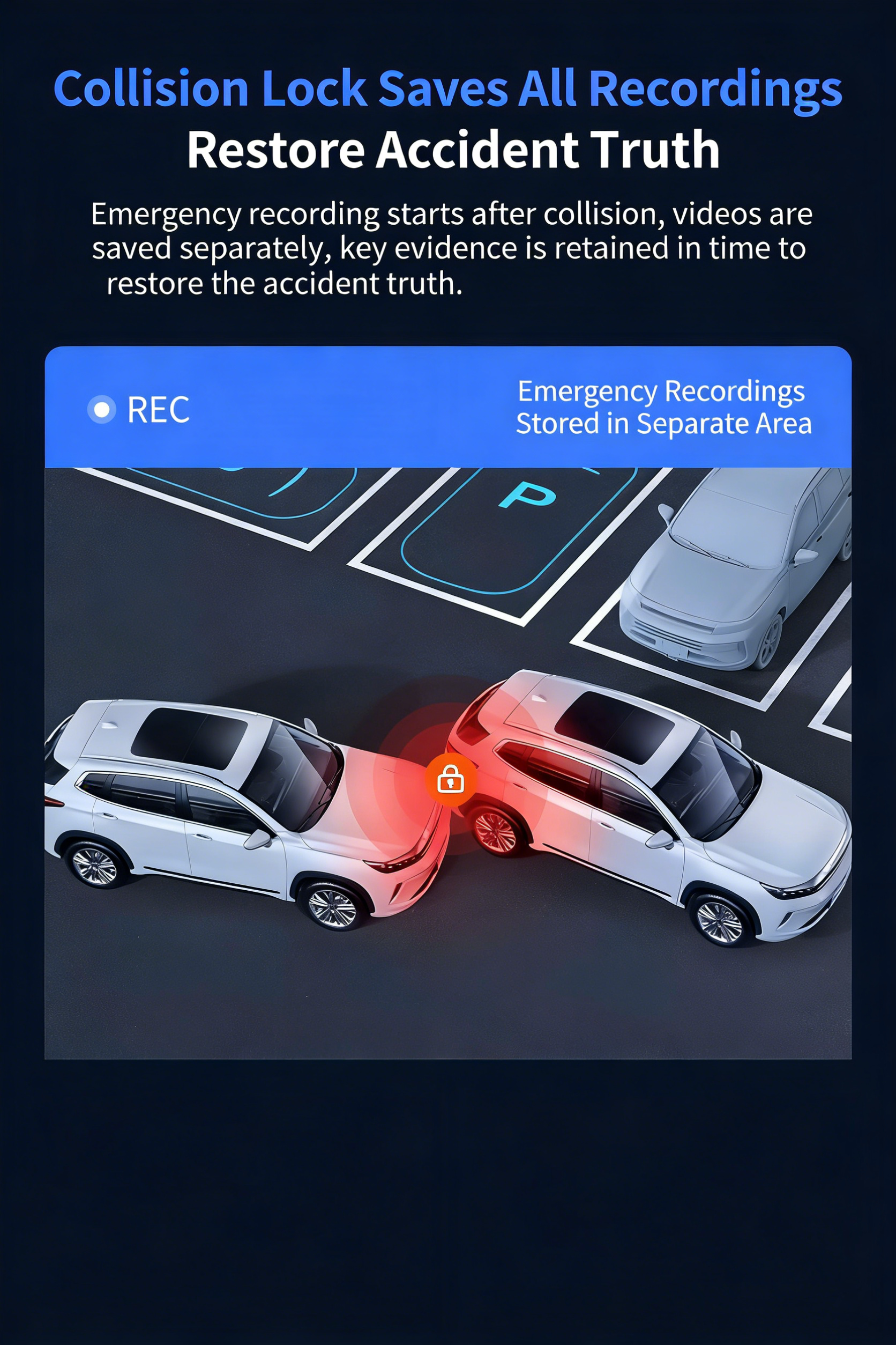 Ütközés rögzítő funkció:Ütközés esetén a rendszer automatikusan zárolja a videót, megőrzi a kulcsfontosságú bizonyítékokat, segítve a baleset körülményeinek visszaállítását. 💥📹
